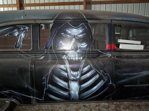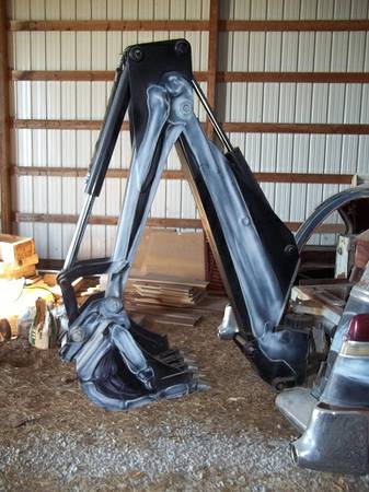 The hearse features a backhoe in the rear that functions, a blade plow in the front, the center section of the hood was removed to feature the reverse headers that will shoot flames out.